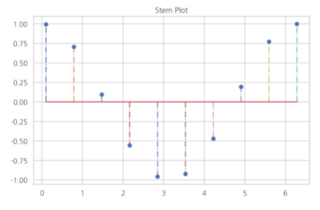 바 차트와 유사하지만 폭이 없는 스템 플롯입니다. 주로 이산 확률 함수나 자기상관관계를 묘사할 때 사용합니다.